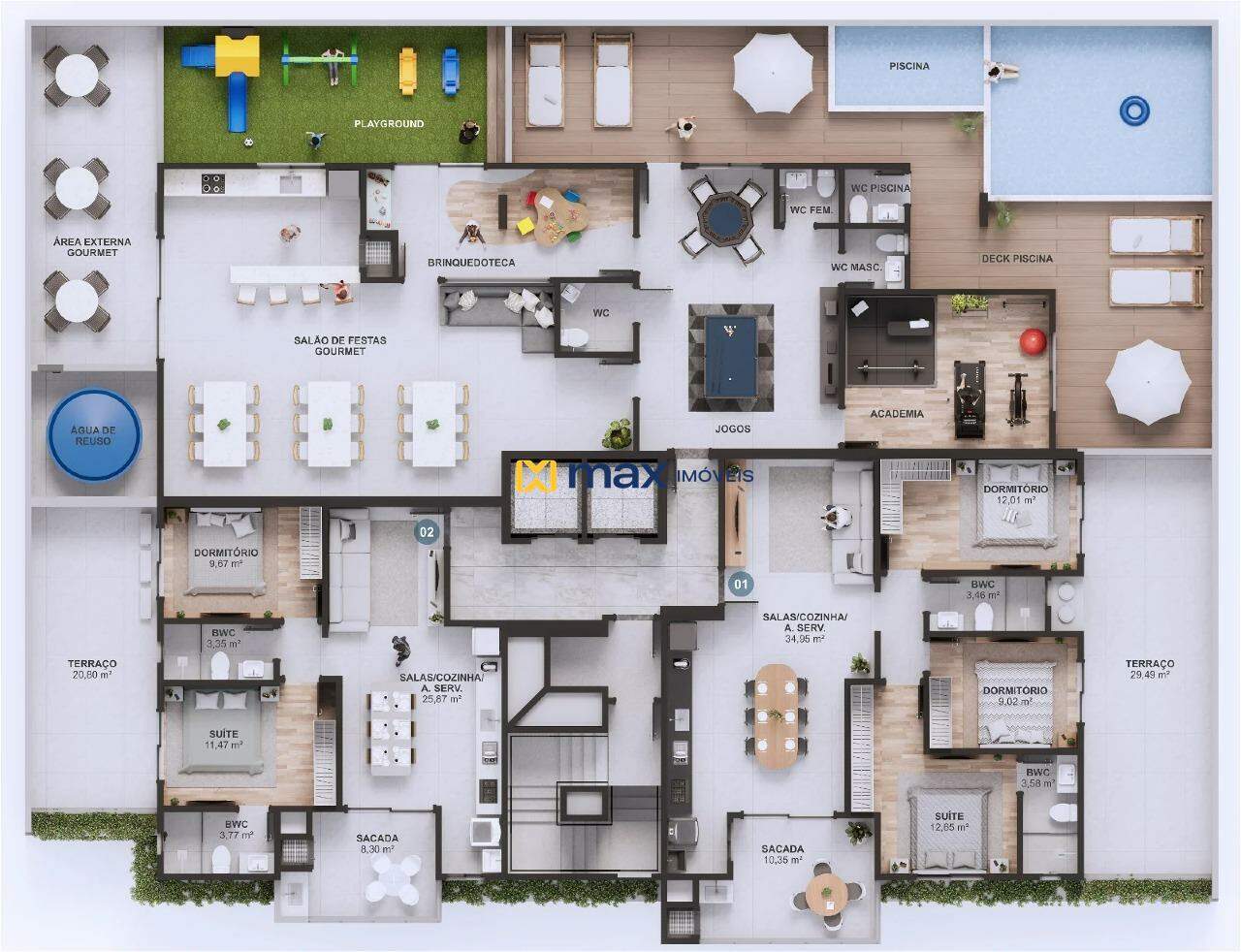 Unidade tipo 01 - Possui 101m² de área privativa, sendo 1 suíte + 2 dormitórios. 2 vagas de garagem .