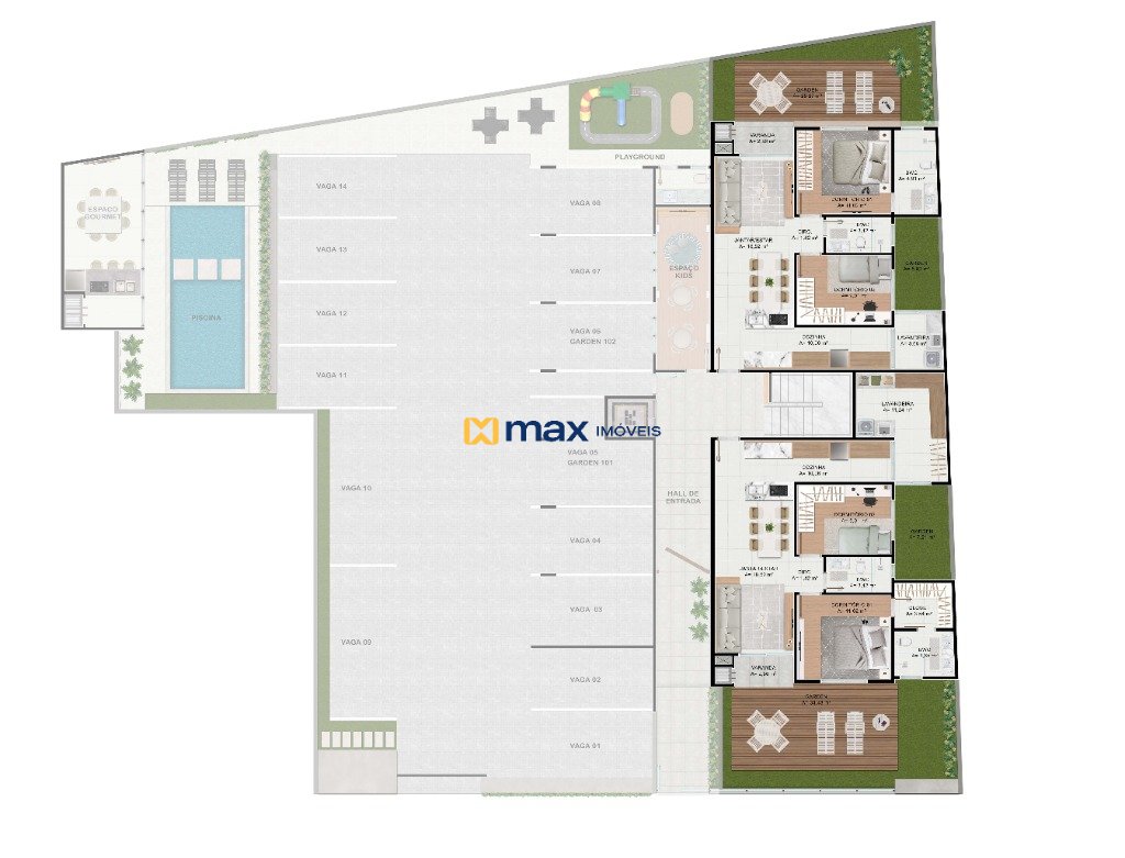 Unidade 101 (Garden) possui 78,46m² de área privativa, sendo 2 dormitórios suítes, living integrando área social com cozinha, sala de jantar e sala de estar, lavabo, sacada com churrasqueira e 1 vaga de garagem